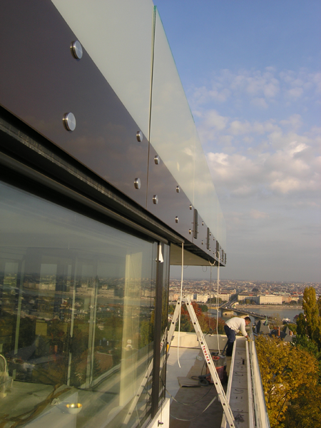 - Budapest, II. ker., Vérhalom u. – beltéri konzolos üveglépcső, külső PLCD üvegkorlát