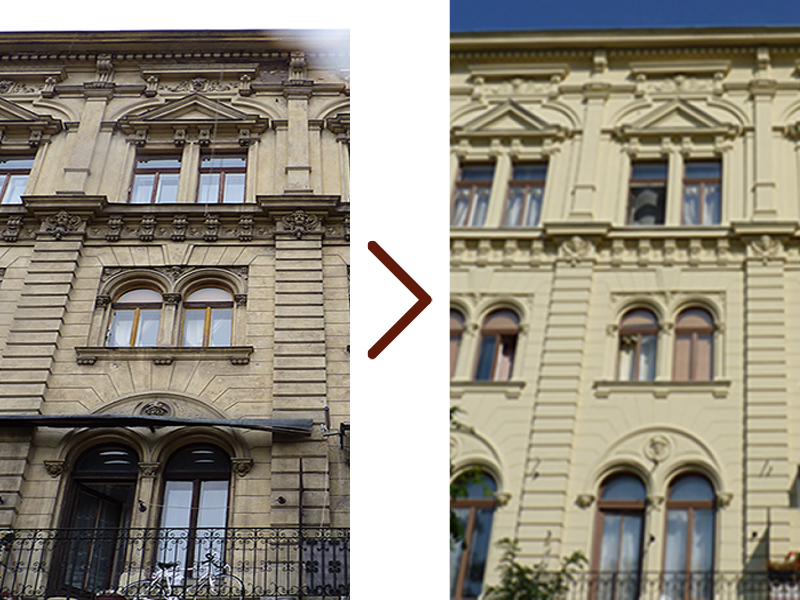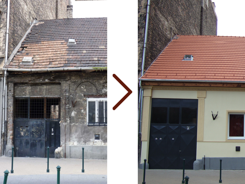- Budapest, VIII. ker., Mátyás tér – bérház homlokzati rekonstrukció, tetőszerkezet csere, lépcsőház és bejárati ajtó felújítás, füstelvezető-rendezés modernizálása